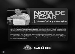 Com profundo pesar, a Prefeitura de Primavera lamenta o falecimento do servidor Edson Fernandes Alves da Silva, conhecido como Edinho, que atuava com dedicação e compromisso como condutor de ambulância, prestando um serviço essencial à nossa população.