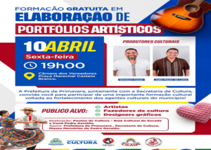 A Prefeitura de Primavera, junto com a Secretaria de Cultura, convida você para uma formação gratuita em elaboração de portfólios artísticos. Um momento pensado pra fortalecer quem vive e respira cultura!