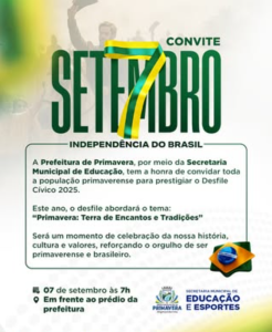 A Prefeitura de Primavera, por meio da Secretaria de Educação, convida toda a população para prestigiar o Desfile Cívico 2025, com o tema: “Primavera: Terra de Encantos e Tradições”.